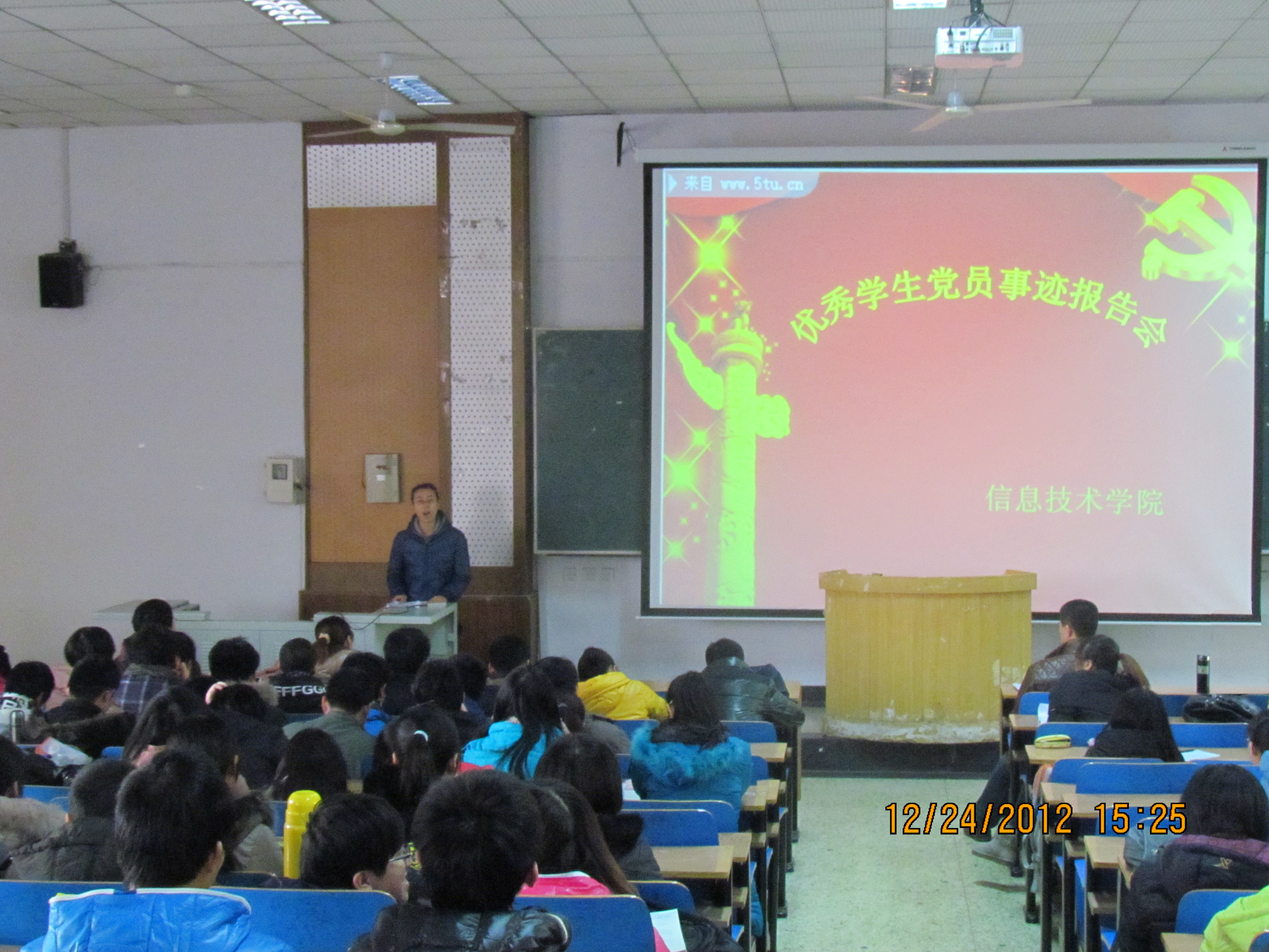 2012年12月24日,德赢Vwin官方区域合作伙伴在C教225教室举行了优秀学生党员事迹报告会。学院党总支书记崔丽娟参加了大会,全体学生党员、入党积极分子、全体班干部及2012级新生聆听了报告。大会由学院党总支办公室主任付春方主持。